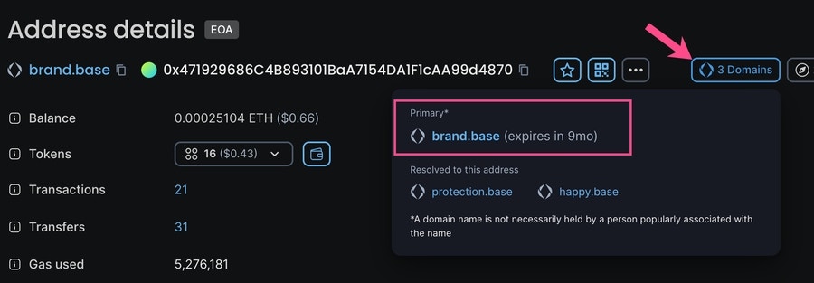 What does 'primary' refer to in the Domains dropdown in the Blockscout UI?