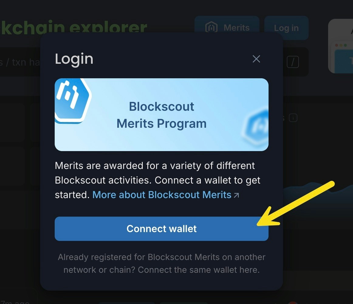 0xaddress) via the Blockscout dashboard and your web3 wallet. - Merits can be earned on any chain where the program is supported, and Merits accumulate to an account across blockchains and rollups.