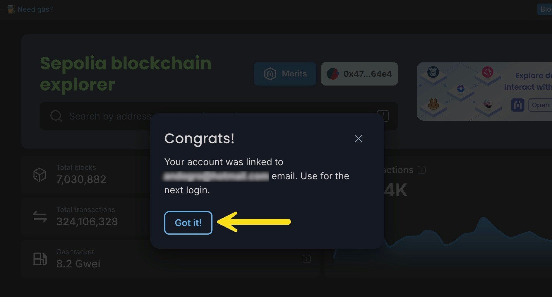 If you already have a Blockscout account, you can still use a referral code to sign up for the Merits program. Login to your Blockscout account and paste in the referral link or press the Merits button to start. Follow the process above starting with step 5.