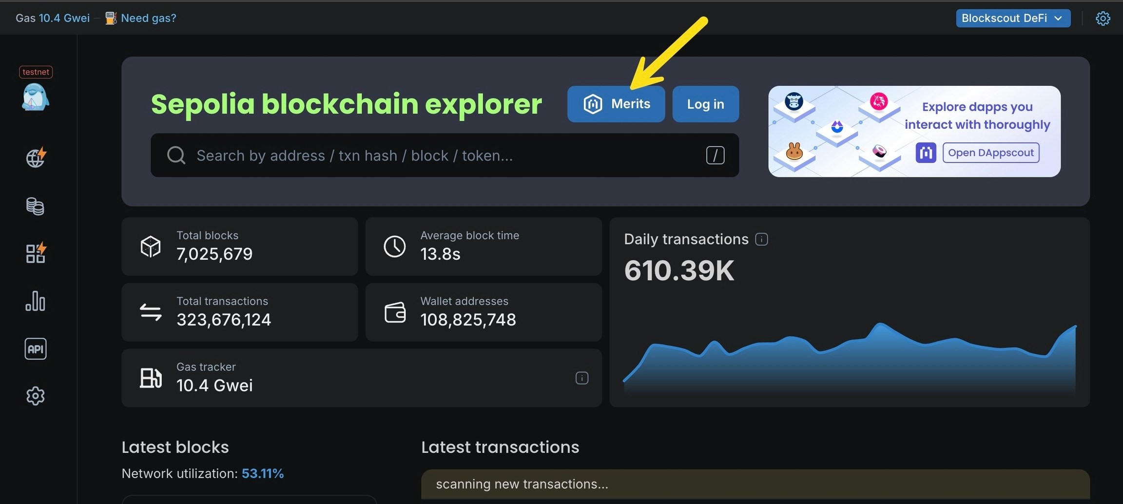 - You can view more information about your Merits, the leaderboard and badges in the dedicated Merits hub at https://merits.blockscout.com/