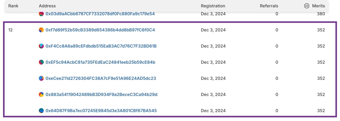 - Ranking is determined by the number of Merits earned. If addresses share the same number of Merits, they all share the same rank. In this example, all accounts have 352 Merits, and are all ranked 12.